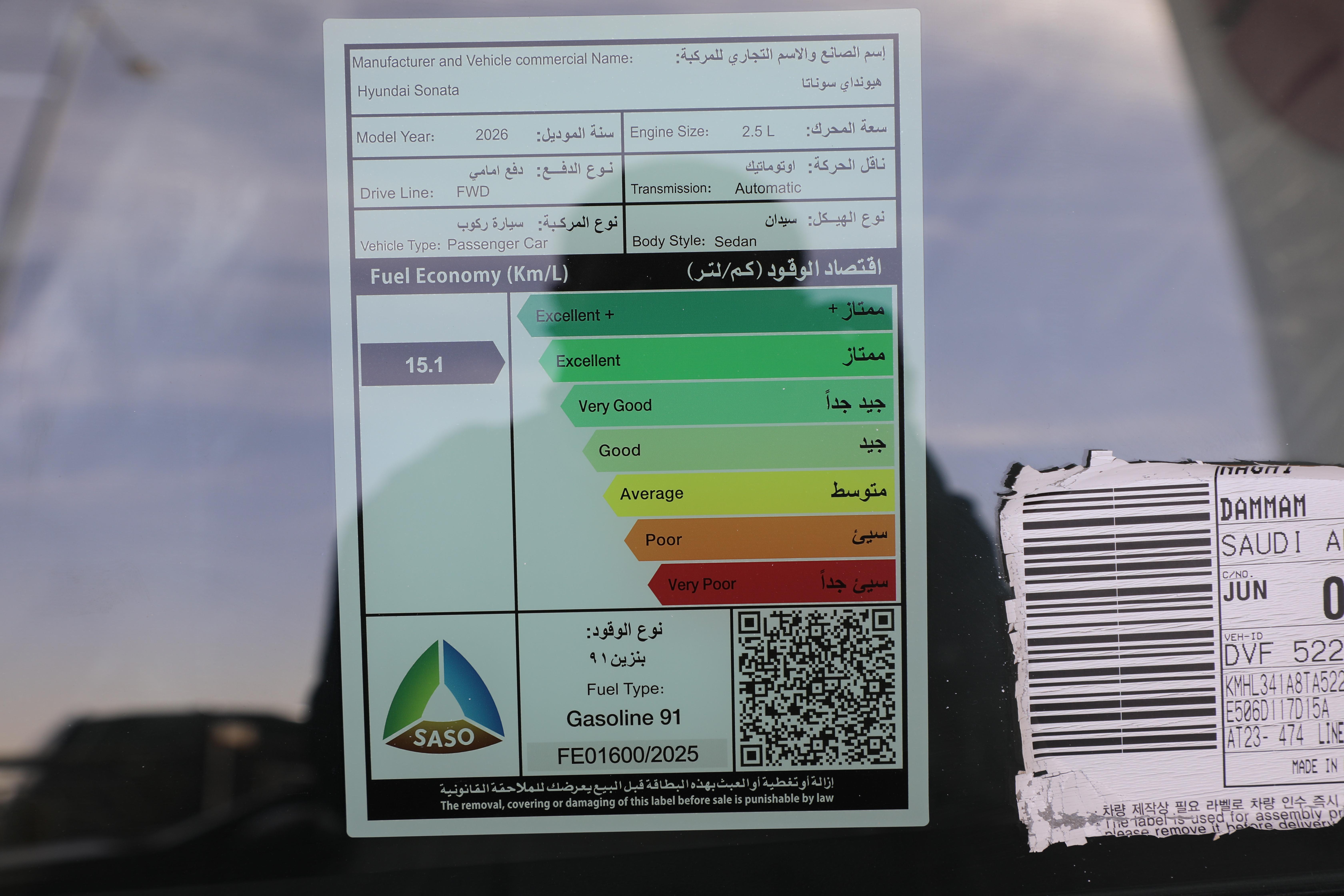 تقدّم سيارة هيونداي سوناتا سمارت 2026 أداءً متميزاً وتصميماً أنيقاً. مدعومة بمحرك 2.5 لتر وناقل حركة أوتوماتيك الذي يوفّر قيادة سلسة ومتوازنة في مختلف الظروف. ويبلغ متوسط استهلاك الوقود للسيارة نحو 15.1 كم/لتر، مما يعكس توازناً بين الأداء والكفاءة. يجمع التصميم الخارجي بين الأناقة والقوة مع خطوط انسيابية تمنح حضوراً مميزاً على الطريق. في المقصورة، توفر السيارة مزايا راحة تشمل تشغيل بصمة, تشغيل المحرك عن بُعد, زر تشغيل المحرك, فرامل يد كهربائية. وتأتي السيارة مزودة بأنظمة أمان حديثة مثل نظام مراقبة ضغط الهواء في الإطارات (TPMS), وسائد هواء أمامية (SRS), نظام الفرامل المانعة للانغلاق (ABS), نظام المساعدة في ثبات السيارة